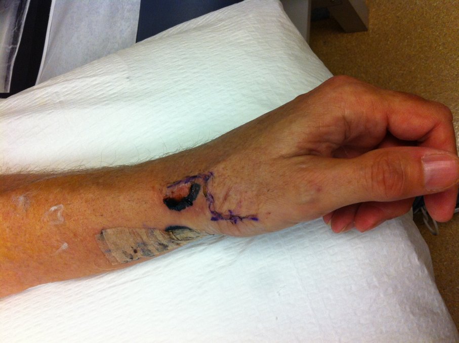 The first cast was removed about 2 weeks after the surgery. You can see the z-shaped incision where the main work was done. The doctor also made a 2-inch incision on the bottom of my arm to harvest a piece of tendon that was used to secure the appliance.