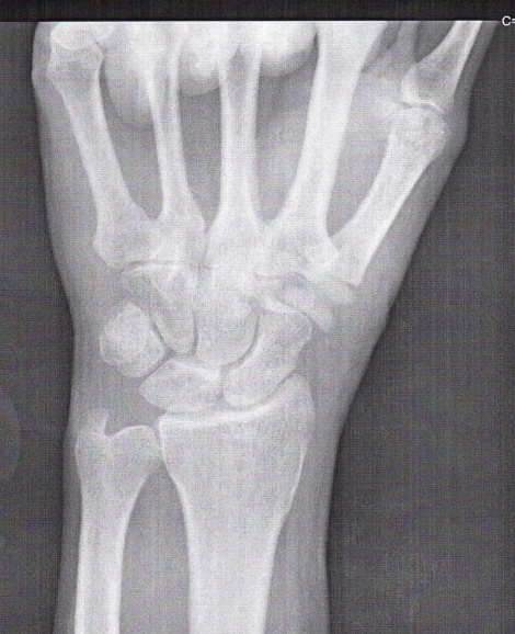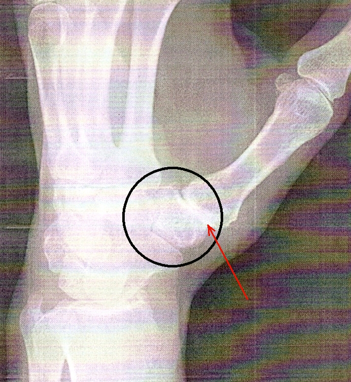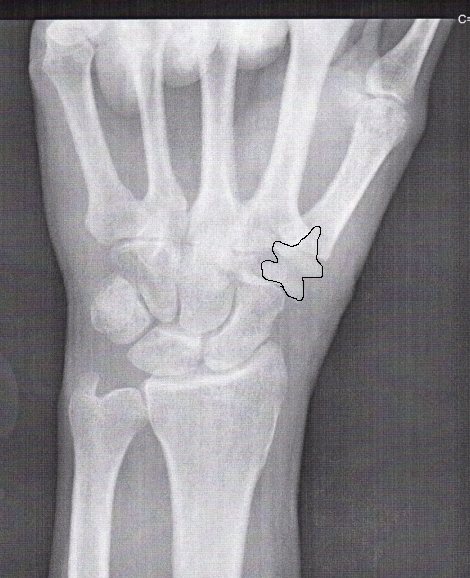 Here's a post-surgery x-ray. The trapezium was removed and replaced with a flexible plastic (maybe nylon or some other appropriate material) appliance. It has a cone shape on the end that was inserted into the end of the first bone of the thumb.